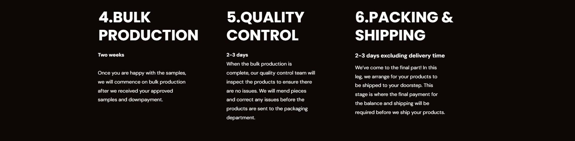 Once you are happy with the samples, we will commence on bulk production after we received your approved samples and downpayment.