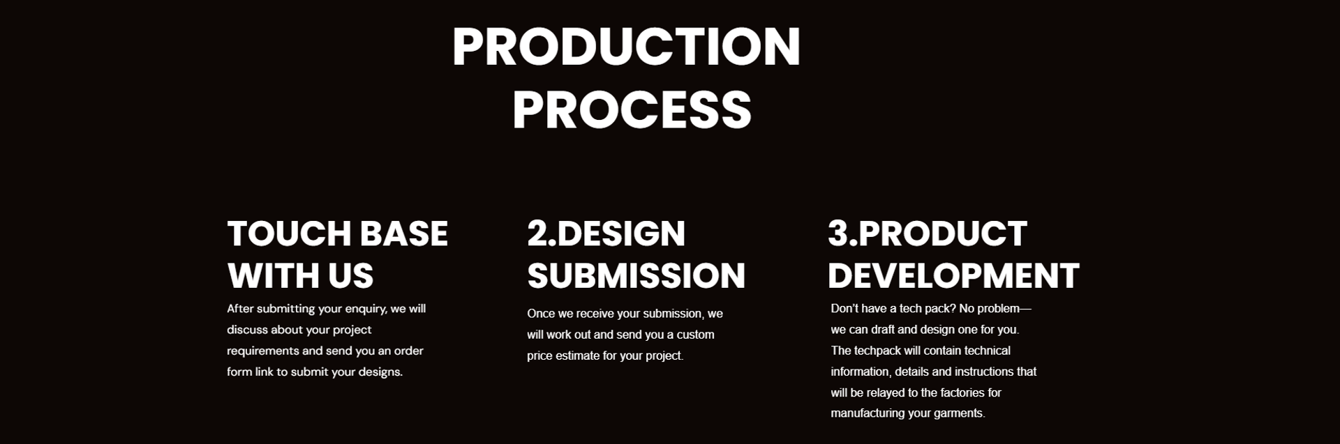 Don’t have a tech pack? No problem—we can draft and design one for you. The techpack will contain technical information, details and instructions that will be relayed to the factories for manufacturing your garments.
